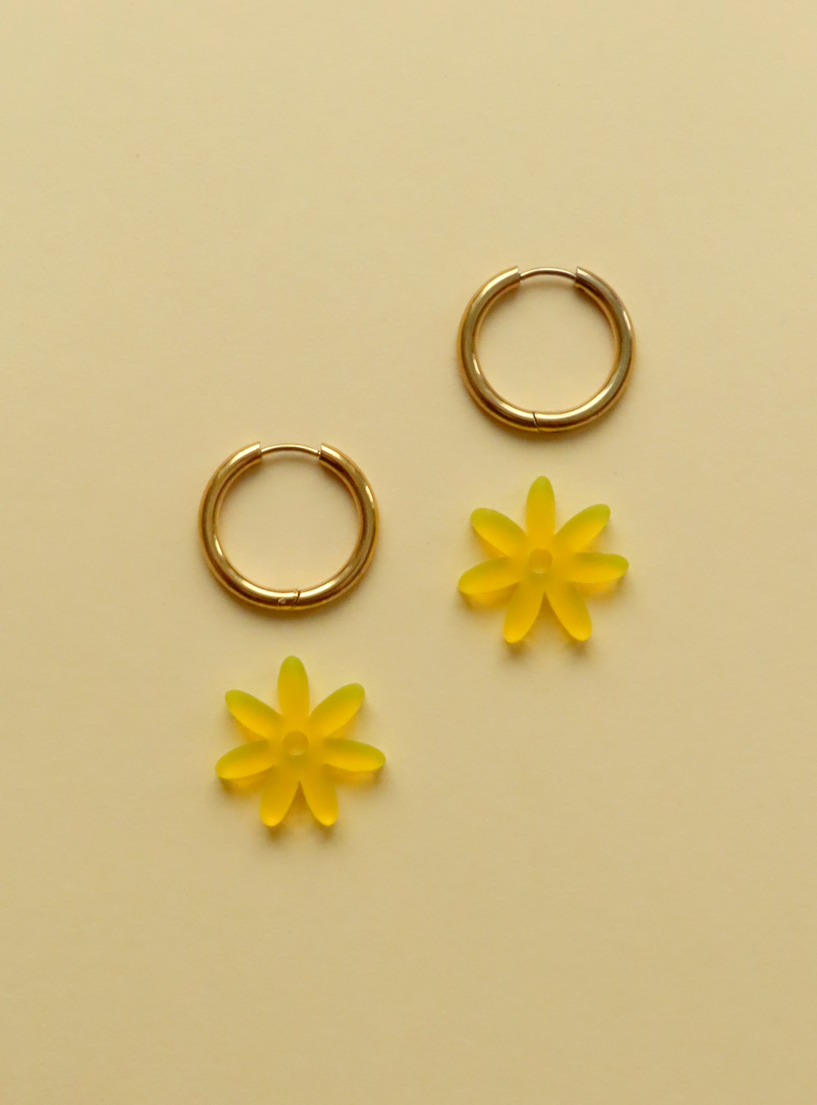 Der Margariten-Anhänger ist aus transparentem Acryl gefertigt und in einem strahlenden Gelb gehalten. Durch die leichte Transparenz wirkt die Blüte fast leuchtend, als ob sie das Licht einfängt und reflektiert. Das verleiht den Ohrringen eine sommerliche, fröhliche Ausstrahlung – frisch, verspielt und lebendig.
