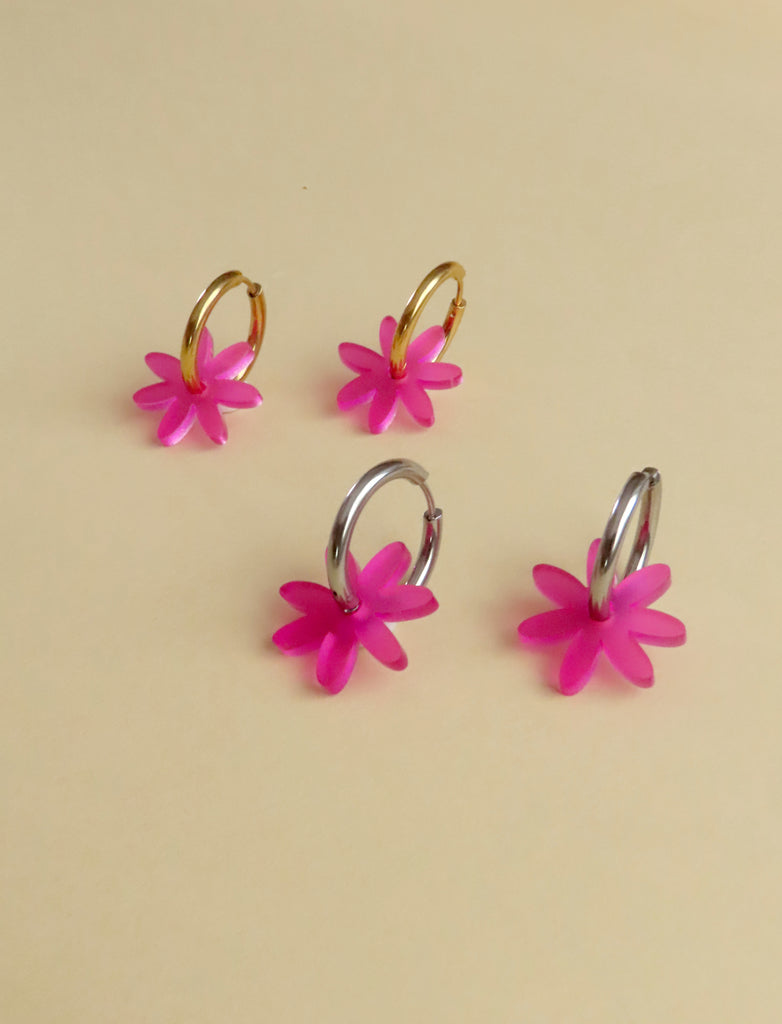 Die lila Margariten bestehen aus transluzentem Acryl, das im Licht wunderschön schimmert. Kombiniert mit den klassischen Edelstahl-Creolen ergibt sich ein Look, der minimalistisch und feminin zugleich ist.