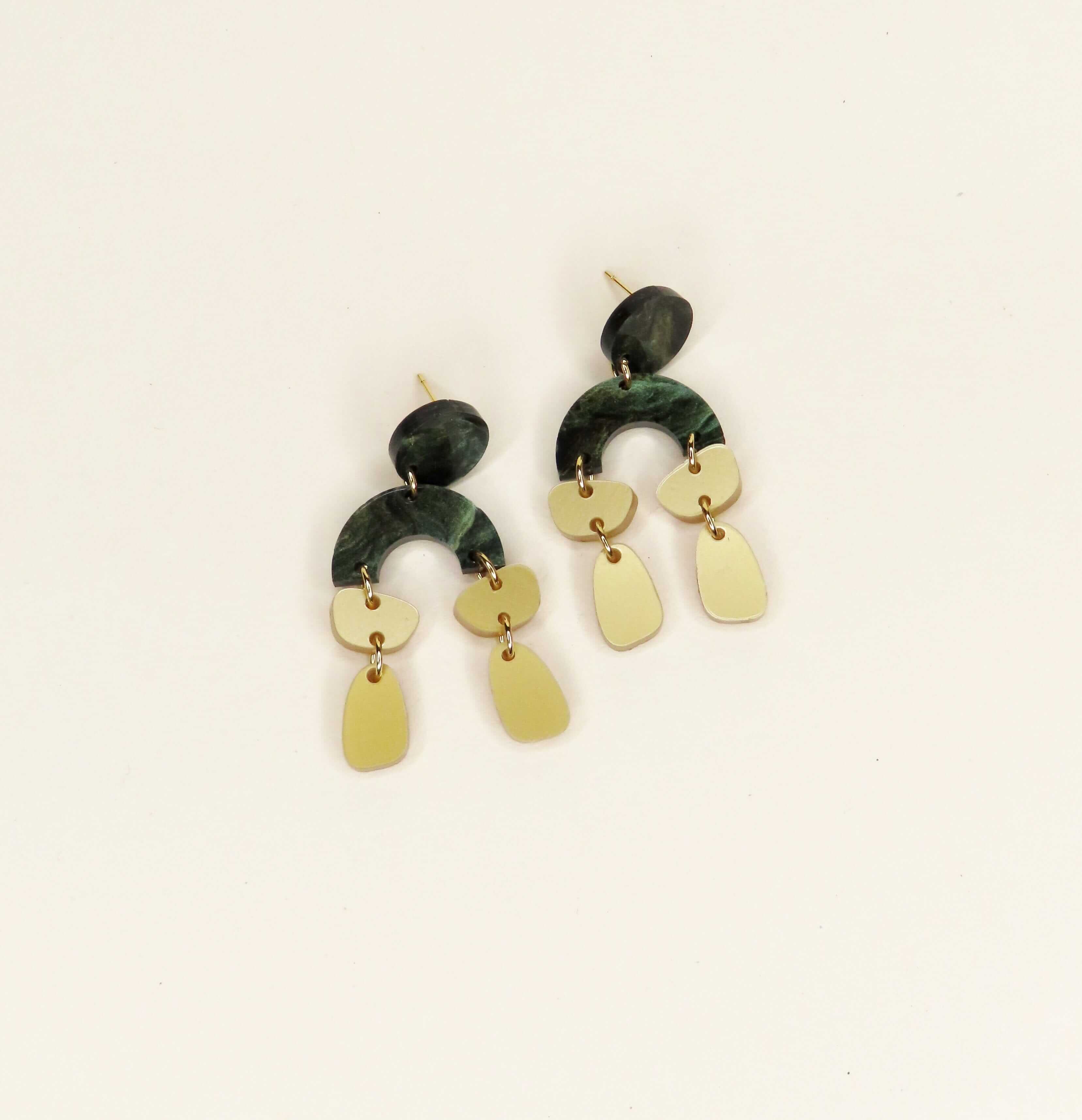 Unsere Ophelia Ohrringe in Marble Gold sind echte Eyecatcher. Das dunkle, marmorierte Grün im oberen Teil erinnert an Naturstein – kraftvoll und elegant.
